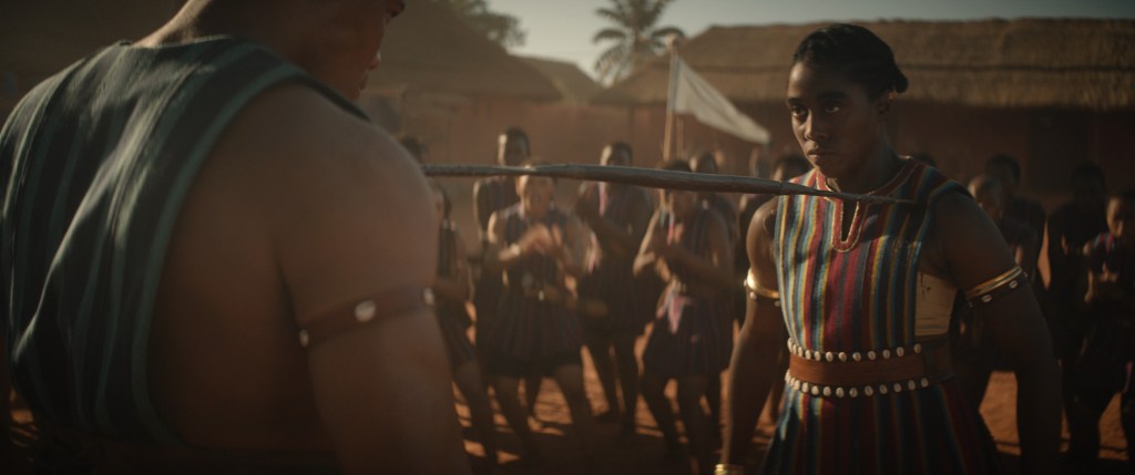 Viola Davis is the fierce war general Nanisca of the Dahome, who leads the all-female Agojie to protect their kingdom against foreign and local aggressors.